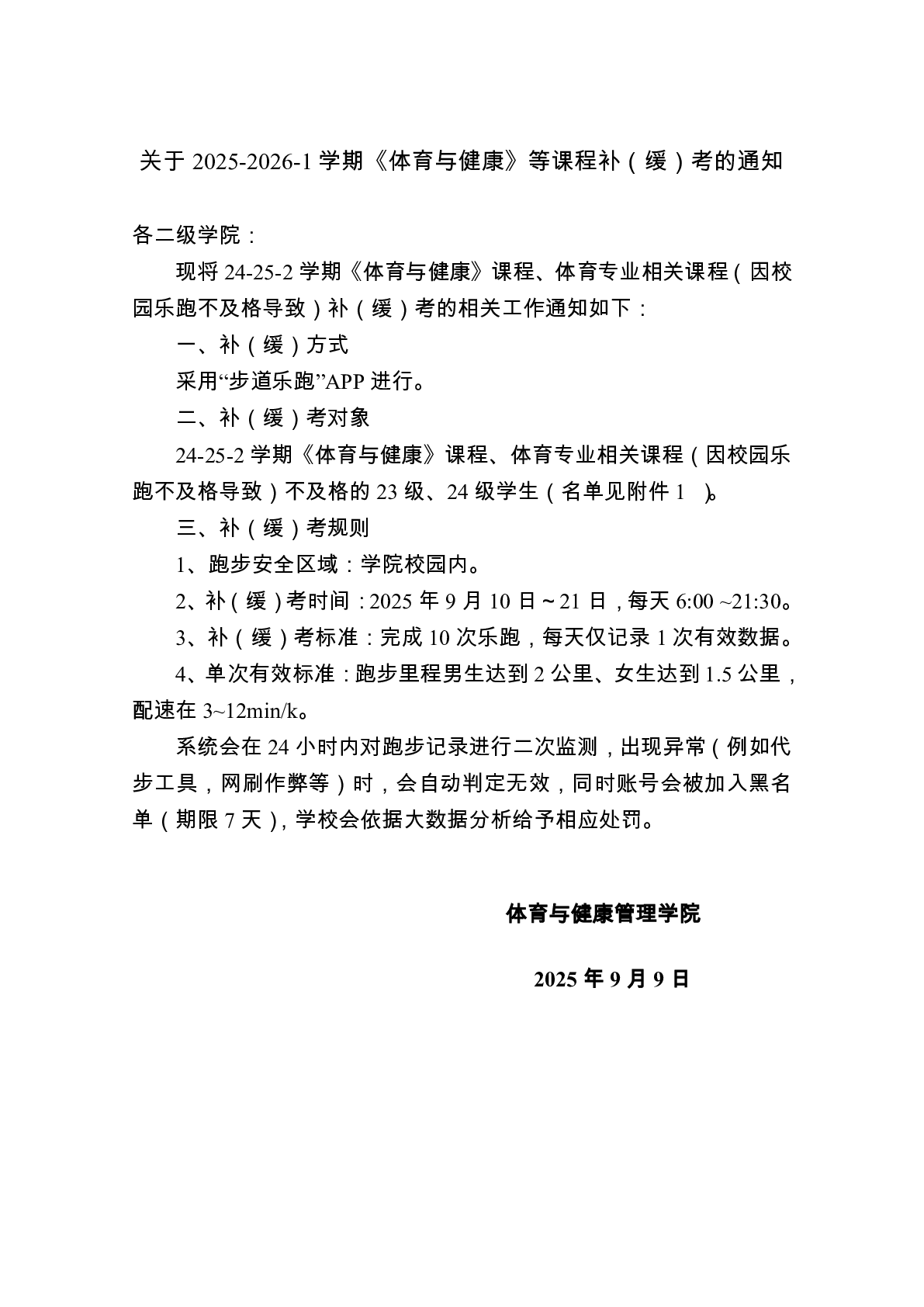 关于2025-2026-1学期《体育与健康》等课程补(缓)考的通知