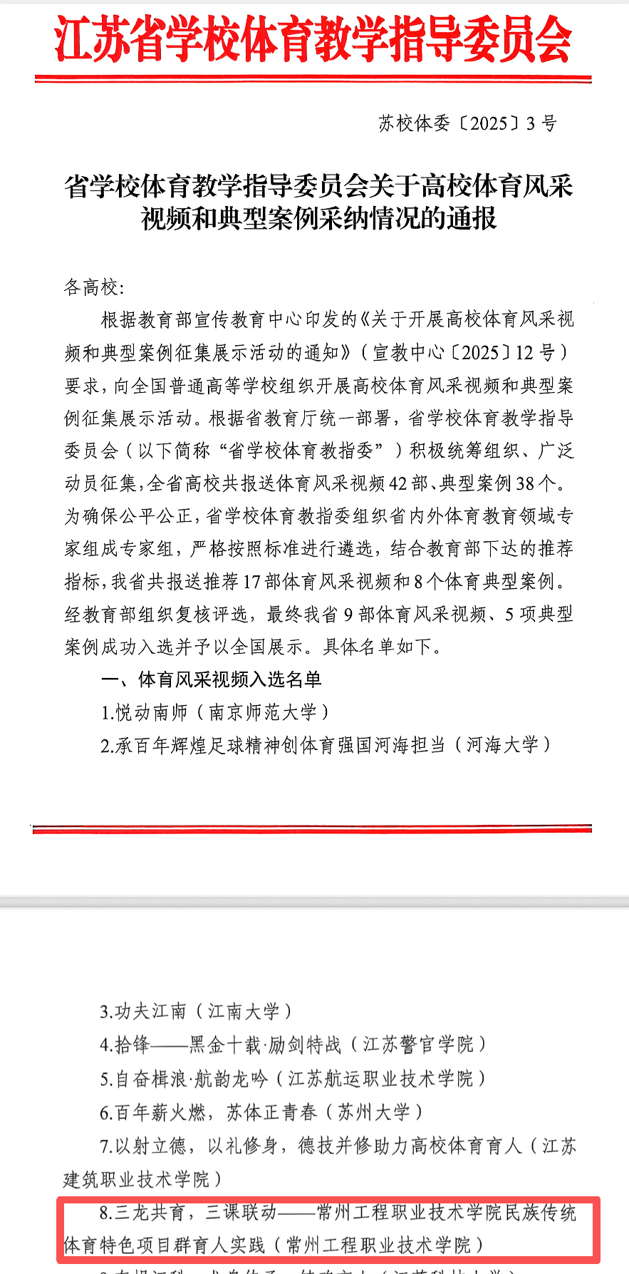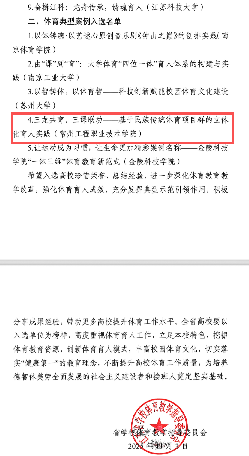 近日,经江苏省学校体育教学指导委员会组织推荐、教育部专家评审,beat365官网报送的《三龙共育,三课联动——beat365平台官方网站民族传统体育特色项目群育人实践》和《三龙共育,三课联动——基于民族传统体育项目群的立体育人实践》分别成功入选教育部宣传教育中心组织的全国高校体育风采视频展示和体育典型案例名单。成为江苏省唯一一所在此次评选中实现“双项入选”的高职院校,充分展现了学校在体育育人方面的扎实成效与创新实践。