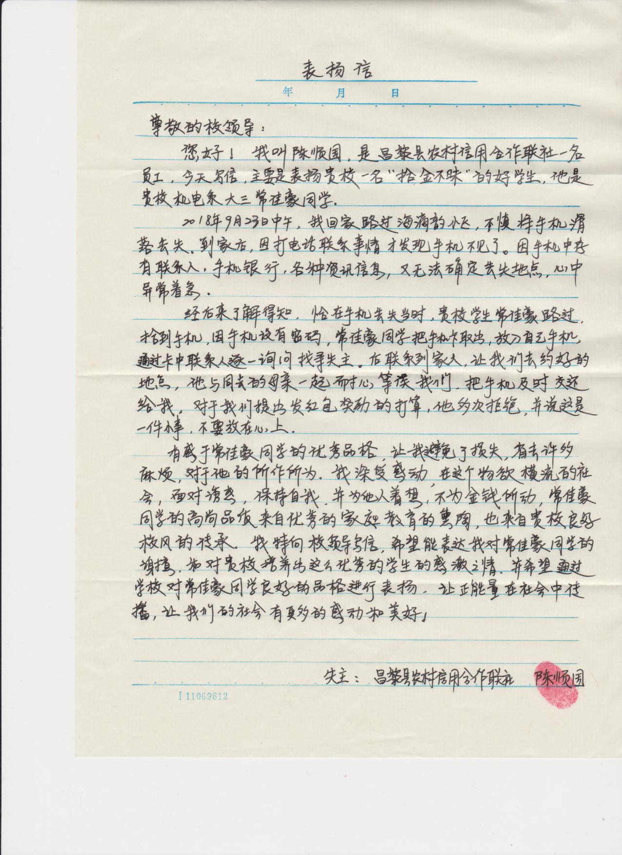 2018年9月26日,365英国上市公司官网收到昌黎县农村信用合作联社员工送来的表扬信,对365英国上市公司官网16级机制专业常佳豪同学帮助找寻手机,坚决不收红包的行为表示感谢,对365英国官网良好校风表示赞扬。昌黎县农村信用合作联社员工因丢失手机异常着急,常佳豪同学路过并拾到手机,与失主家人取得联系,第一时间将手机归还,并多次拒绝失主的红包奖励,最后在失主的一再追问下才告知了学校名字和自己的姓名。失主随即来到365英国上市公司官网,将感谢信送到该院领导手中,这时大家才知道该院学生拾金不昧暖人心的感人事迹。