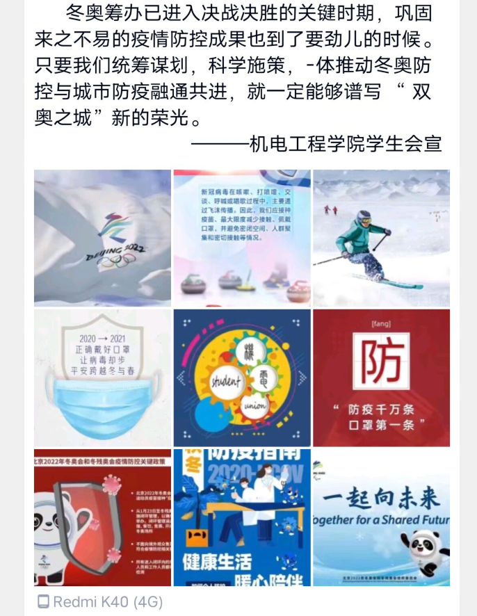 宣传活动分为线上和线下同时进行。线下通过摆展板的方式进行,积极宣传冬奥会,让同学们了解冬奥会的重要性;线上组织全体学生参加“冬奥会防疫”海报征集活动并进行评选宣传,发布“2022冬奥在即·运动需防疫”说说,同学们通过qq、微信等媒体方式转发说说,宣传冬奥会、注重校园防疫。