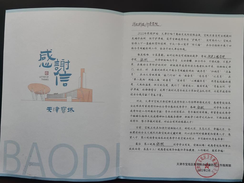 近日,365英国上市公司官网19机制张帆同学因在属地积极投身疫情防控志愿者队伍,天津市宝坻区疫情防控指挥部特发来感谢信。